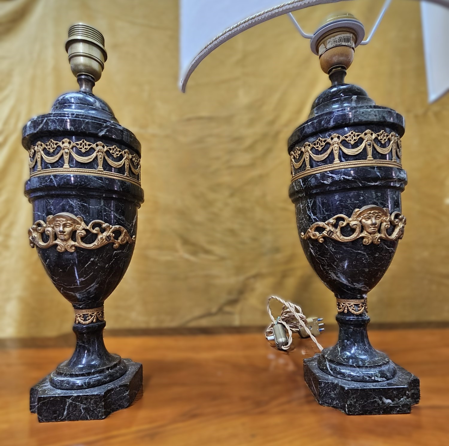 Coppia di abatjour in marmo verde delle alpi e decorazioni in bronzo dorato, Fine XIX secolo / inizio XX secolo