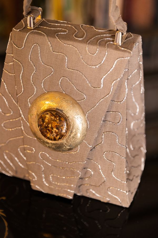Borsa Lavi Bags realizzata a mano in tessuto cotone con ricami in lurex con gioiello in ottone cromato e pietra in resina
