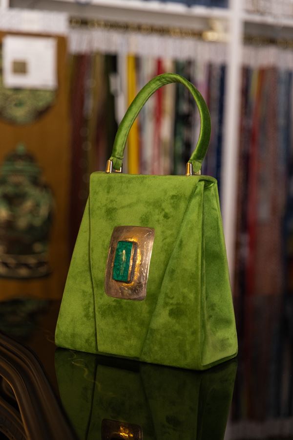 Borsa Lavi Bags realizzata a mano in velluto verde con inserto centrale in ottone cromato e pietre impresse con resina verde