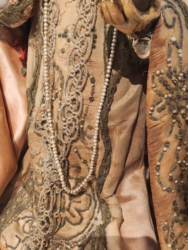 Bambinello in terracotta con vesti con intarsi e collana in corallo