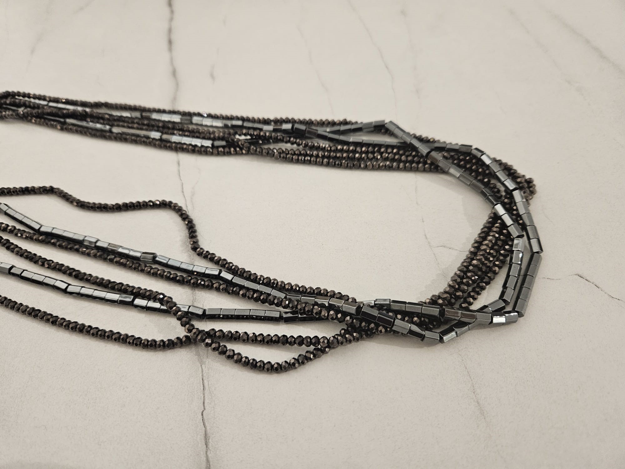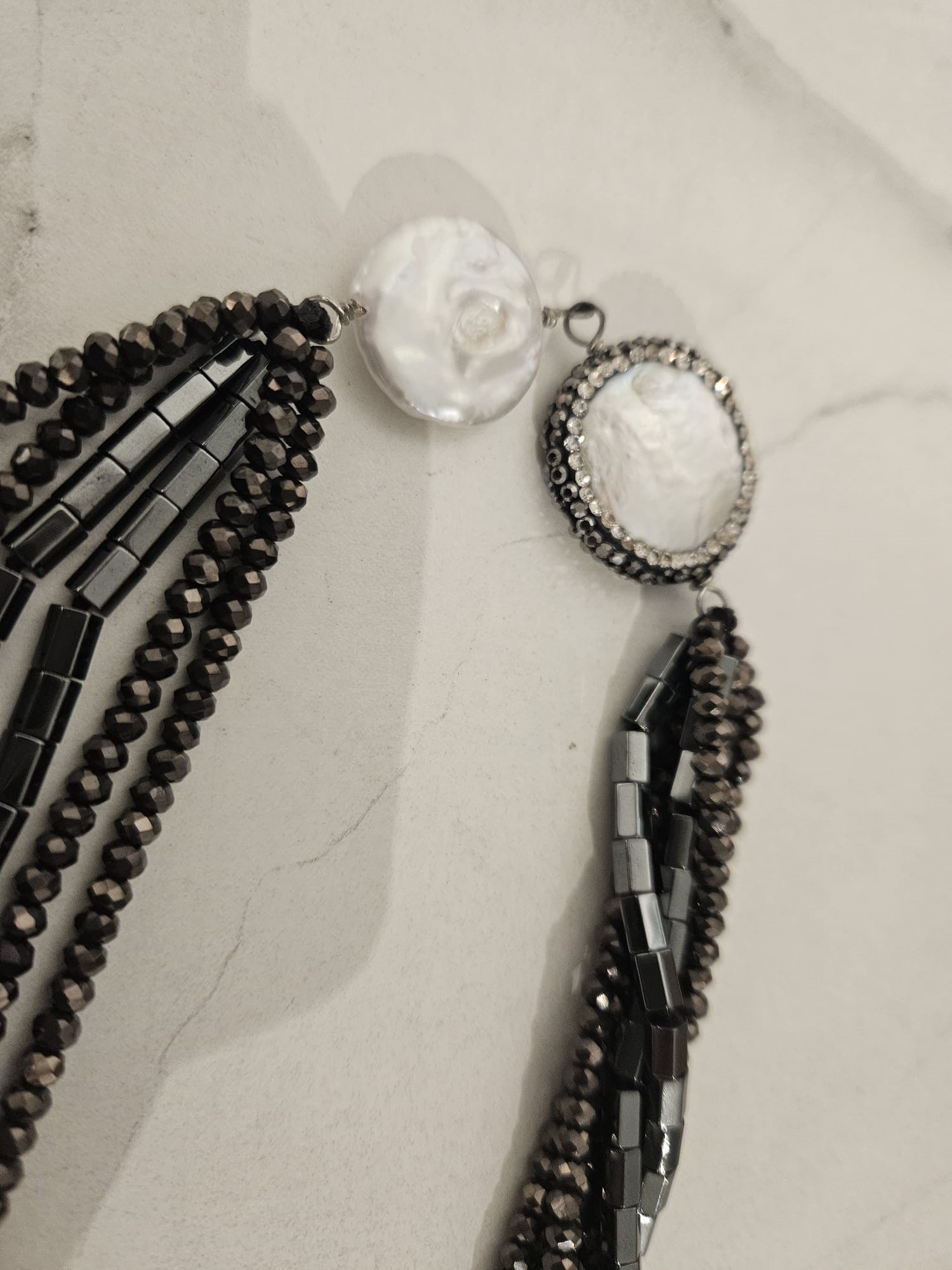 Collana nera con pietre piatte simil madreperla e perline nere e grigie