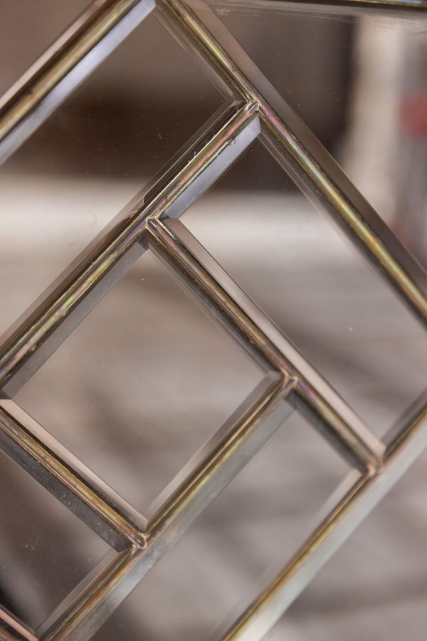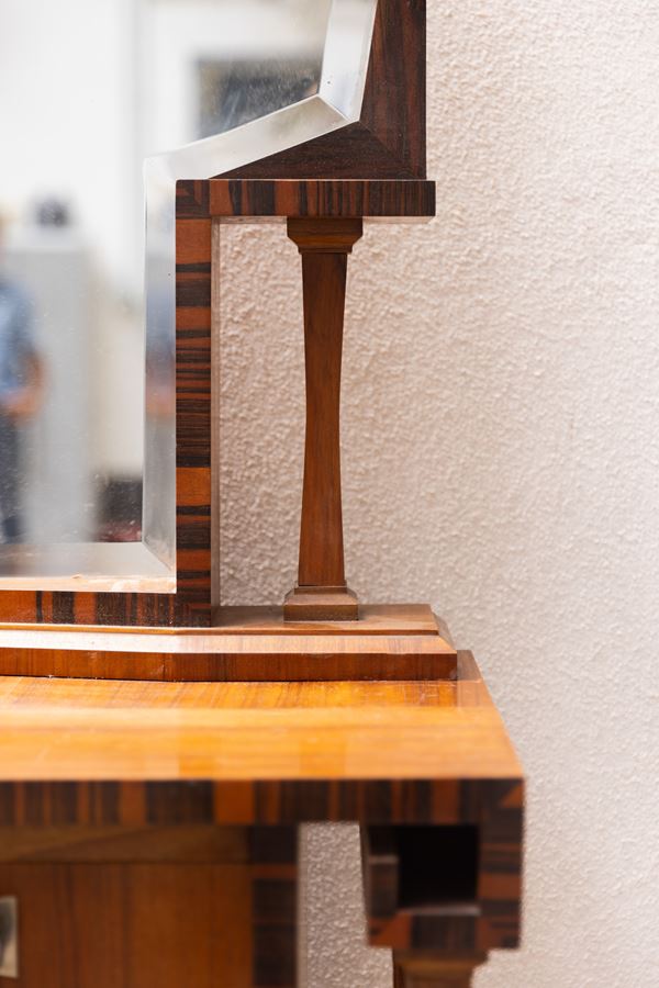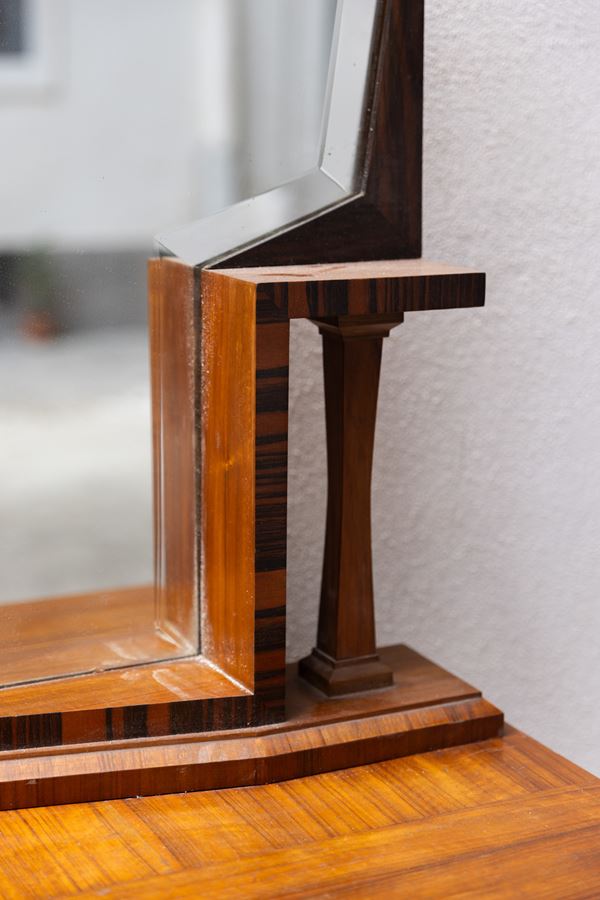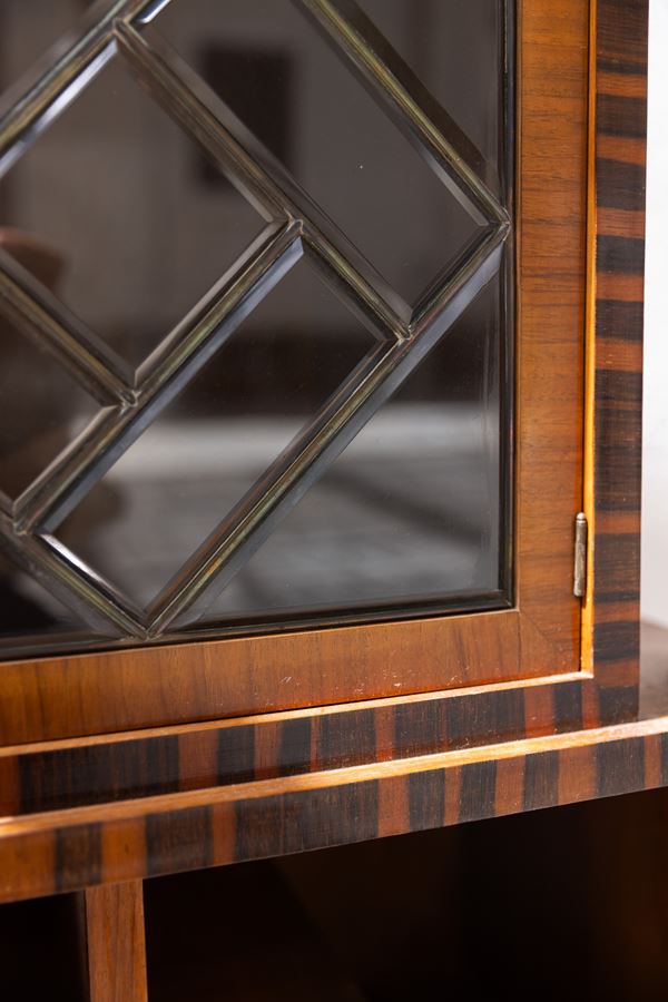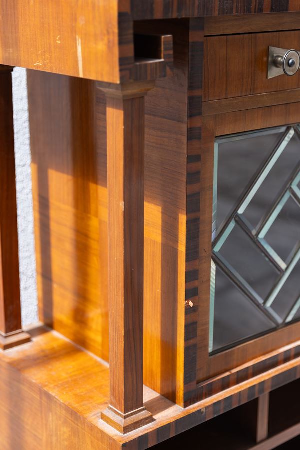 Credenza déco in legno di noce e palissandro rio con specchio e colonne laterali