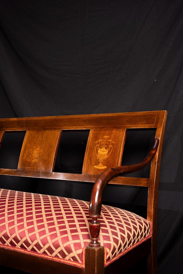 Divanetto liberty in legno di noce con intarsi.Altezza complessiva 86 cm, altezza seduta47 cm, larghezza totale 139 cm