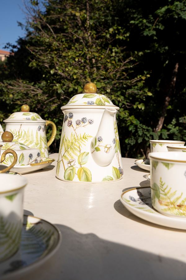 Composta da caffettiera, teiera, lattiera, zuccheriera, burriera, sale, pepe, 3 tazzine caffè, 6 sottopiattini, 6 tazze da thè/tisane e 6 sottopiatti