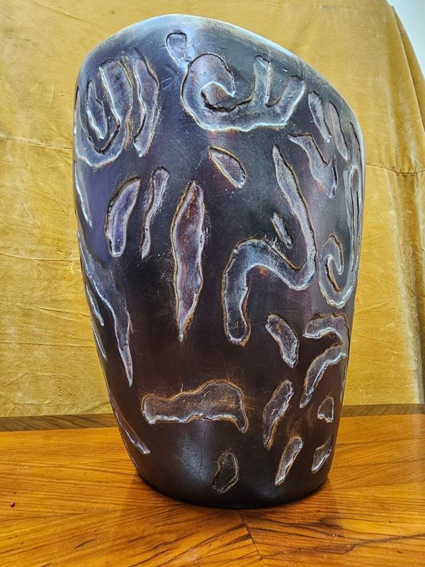 vaso Lam Lee in terracotta con decori scolpiti a mano nei toni del bruno