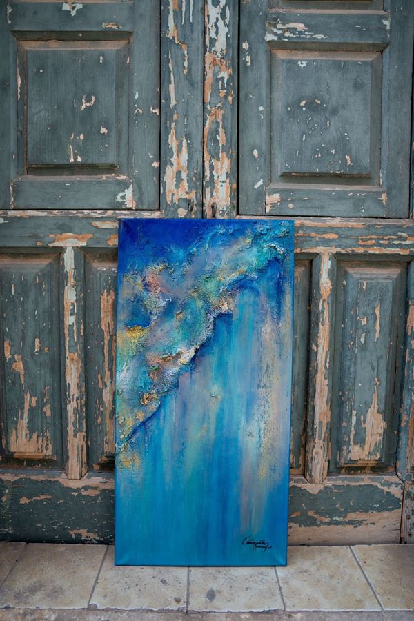 Acrilico, pietre piccole cemento e colate di vernice trasparente