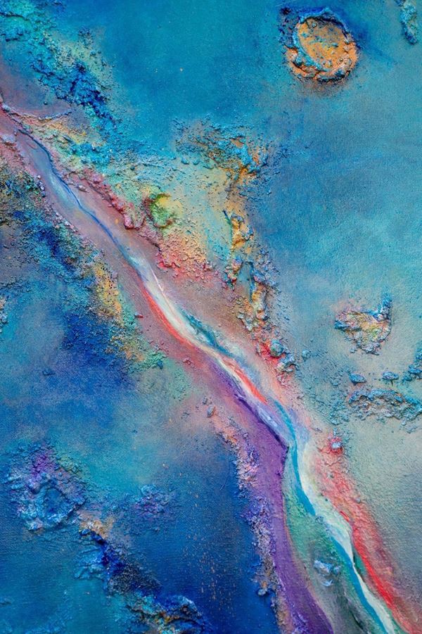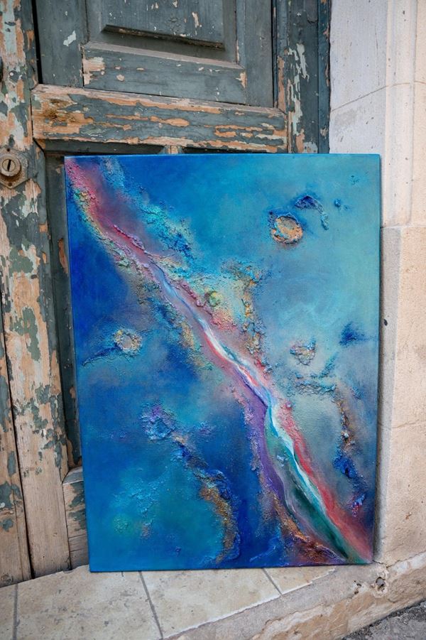 Acrilico, pietre piccole cemento e colate di vernice trasparente