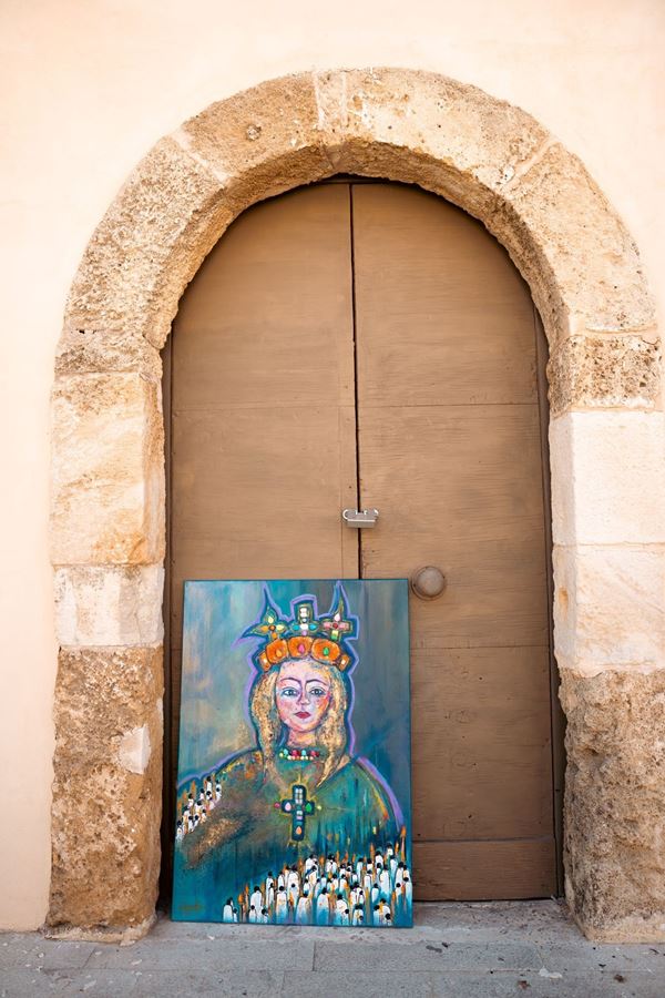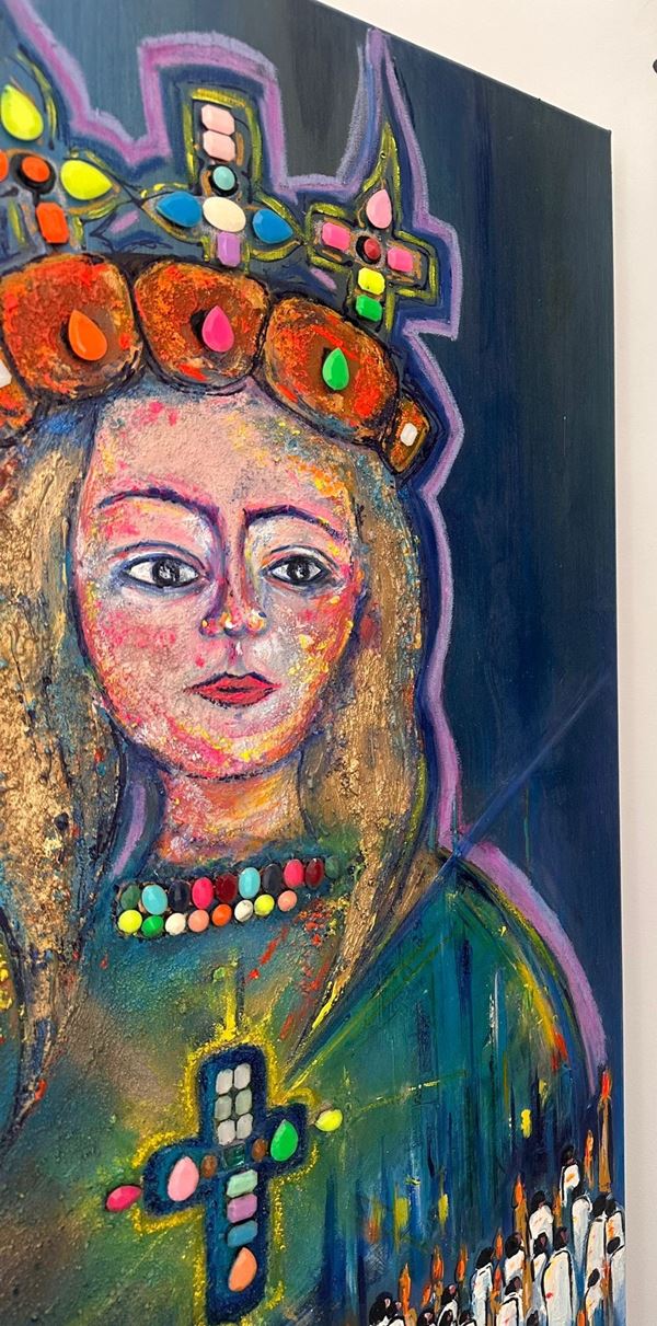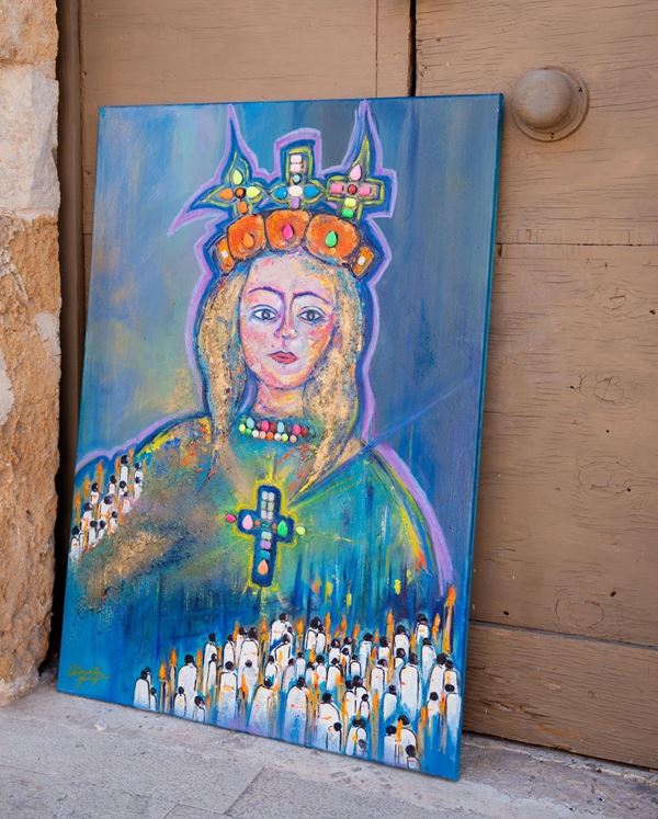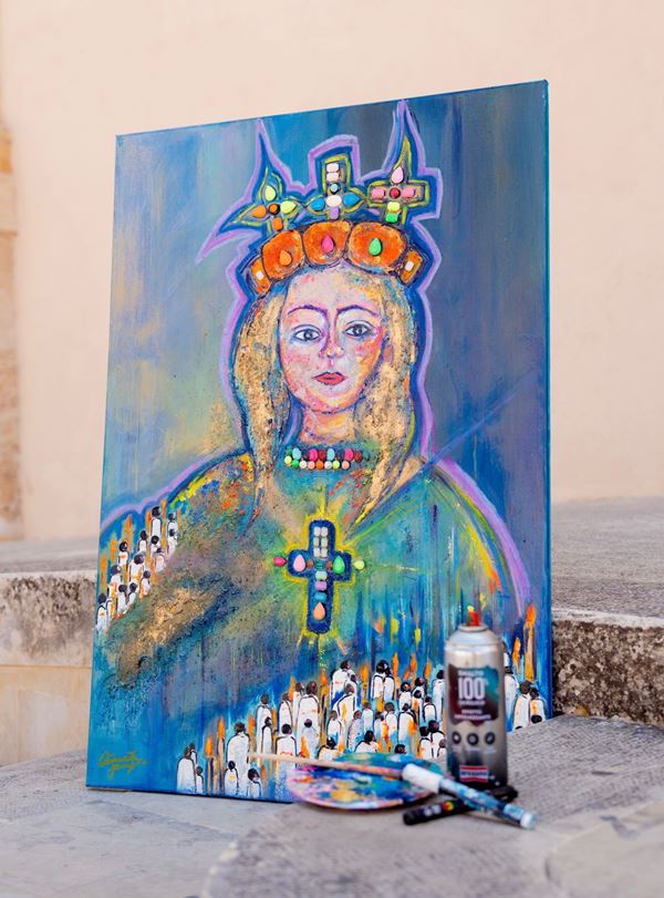 Acrilico, pastelli, vernice spray, pietre sintetiche, sabbia decorativa. Lucido a zone.