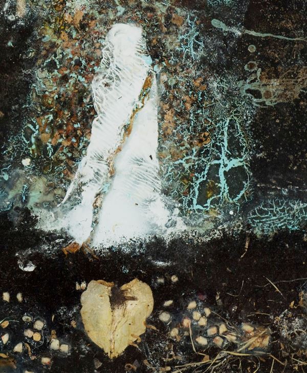 Torba, idropittura, impregnante, fogliame, gommalacca, fiori e frammenti di protesi dentarie su vetr