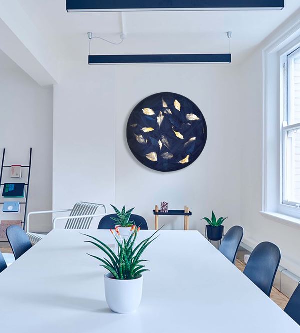 Elementi naturali, tessuto, carta, collage, acrilici, foglia oro, su tavola, all'interno di una teca circolare